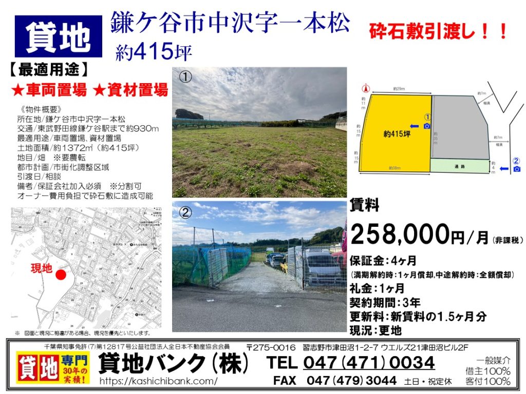| 設備・条件 | 保証会社加入必須。オーナー費用負担で砕石敷に造成可能 ※分割可能です。 | ||