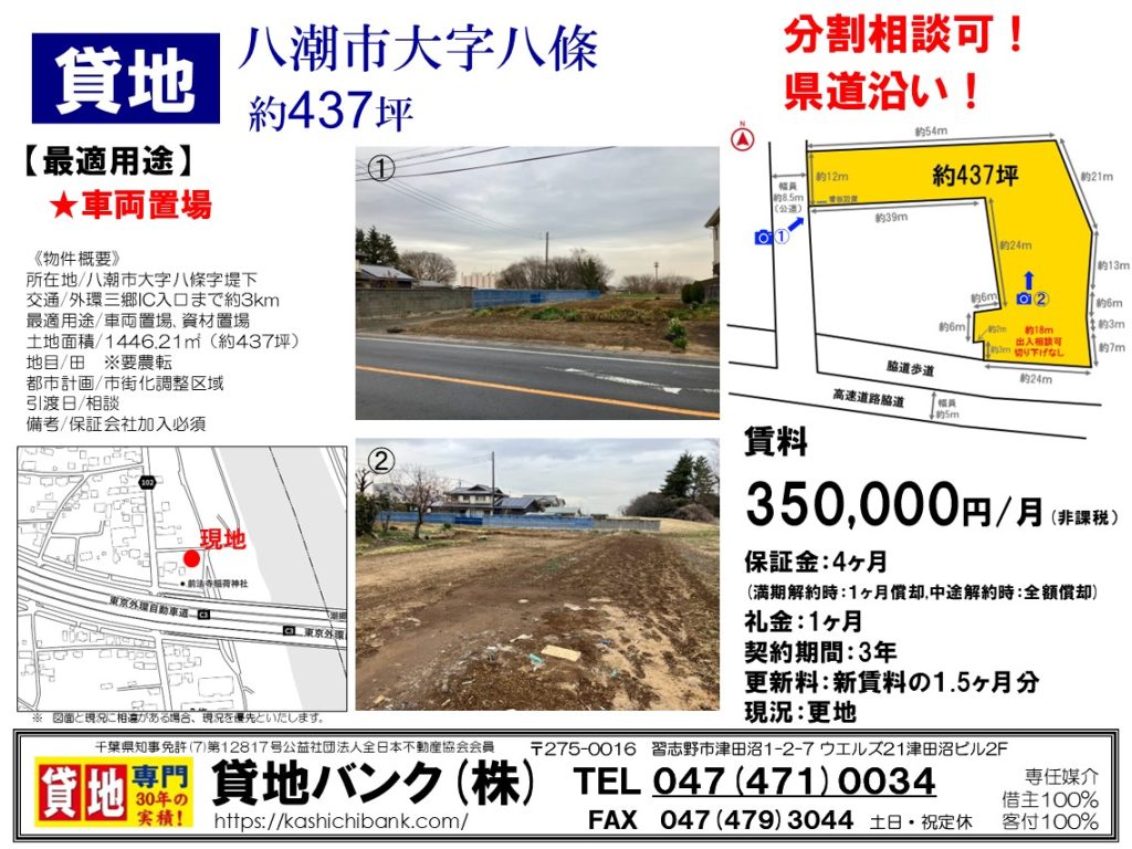 車両置場に最適! 分割相談可! 県道沿い! 外環三郷ICまで約3km! 前面道路幅員約8.5m
