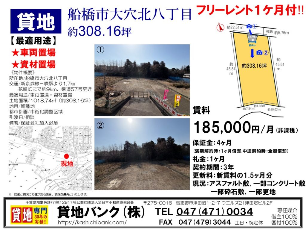 | 設備・条件 | 砕石敷き アスファルト敷き コンクリート敷き 幅員4m以上 保証会社加入必須。フリーレント1ケ月付。上水道引込み可、電柱ポール有り(各引き込み借主負担) | ||