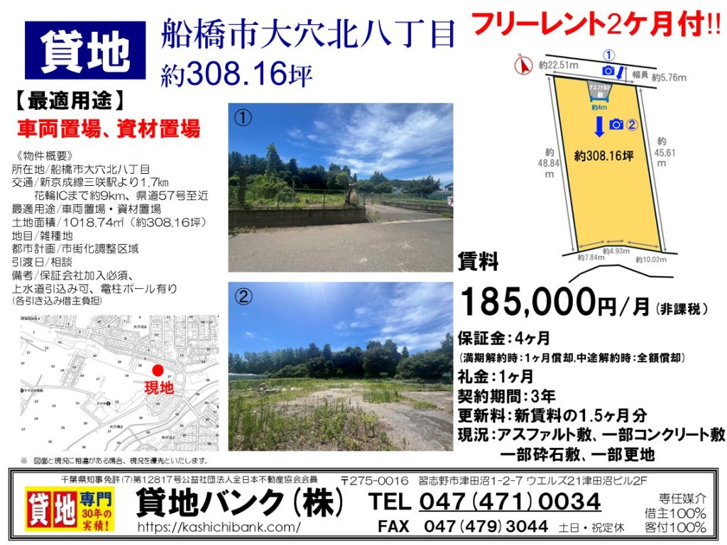 | 設備・条件 | 砕石敷き アスファルト敷き コンクリート敷き 幅員4m以上 保証会社加入必須。フリーレント2ケ月付。上水道引込み可、電柱ポール有り(各引き込み借主負担) | ||