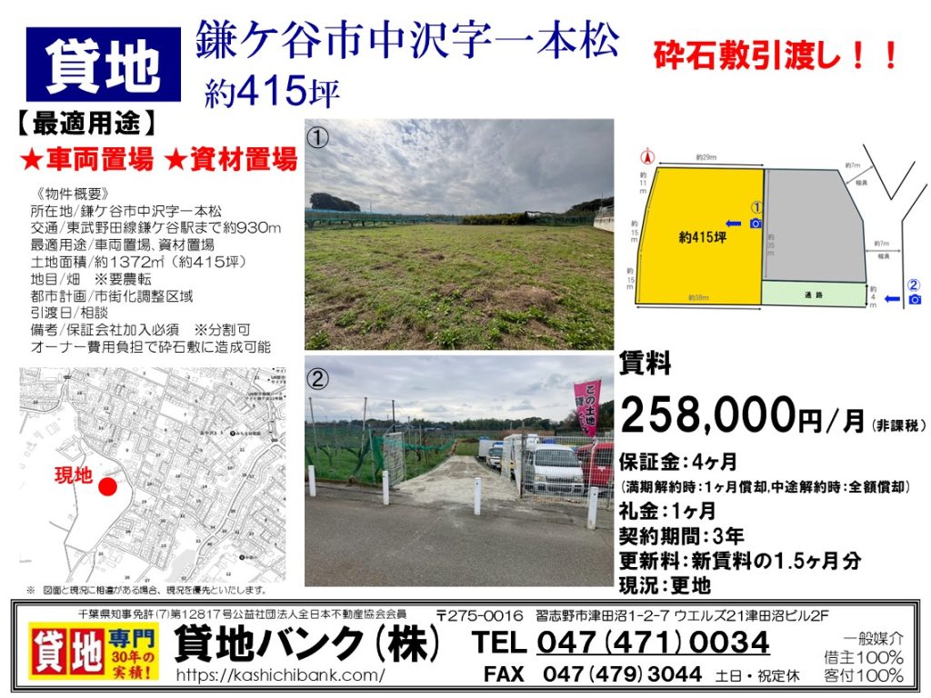| 設備・条件 | 保証会社加入必須。オーナー費用負担で砕石敷に造成可能 ※分割可能です。 | ||