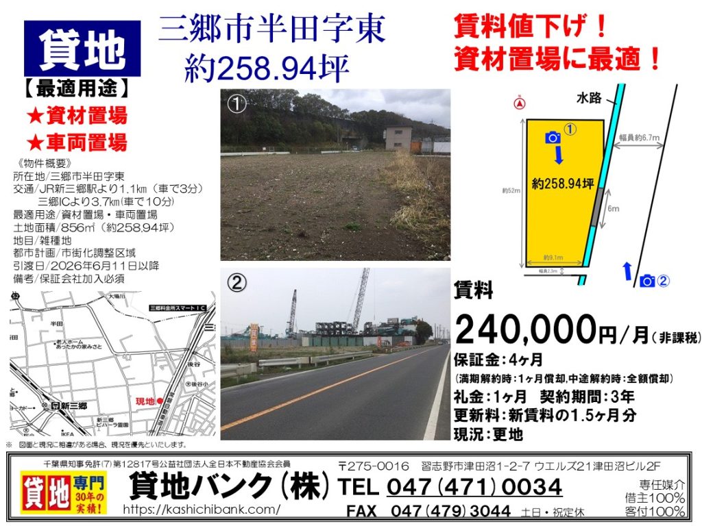 大型車両の出入り可! 前面道路の幅員6.7mあります。 東京外環自動車道、常磐自動車道 三郷ICまで3.7km 三郷西インター、三郷中央インターも近く交通の便のよい物件です。資材置場や車輛置場に最適!! 武蔵野線「新三郷」駅 車で3分! 高速道路沿いの物件。 お引渡しは2026年6月11日以降となります。